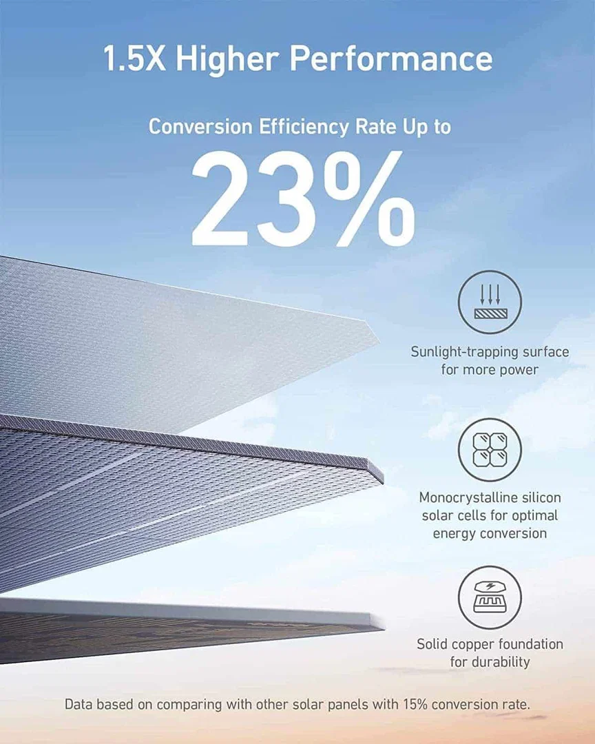 Dzięki wysokiej efektywności na poziomie 23% możesz mieć pewność, że nawet w mniej sprzyjających warunkach pogodowych panel skutecznie przekształci światło słoneczne w energię, zapewniając niezależność energetyczną bez względu na warunki. Tak wysoka efektywność pozwala na maksymalne wykorzystanie energii słonecznej, która zapewni Ci niezawodne zasilanie, gdziekolwiek jesteś.