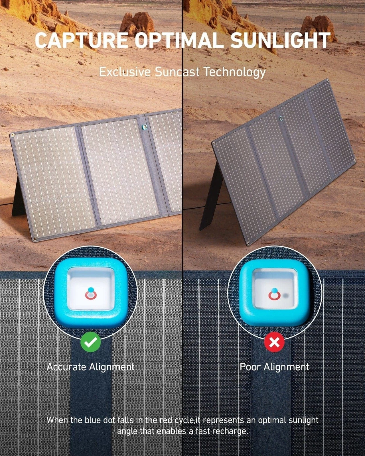 Panel ANKER 625 został wyposażony w zastrzeżoną technologię Suncast firmy ANKER, dzięki której masz możliwość dopasowania panelu względem słońca tak, aby światło słoneczne bezpośrednio padało na panel, co zapewni maksymalne naładowanie urządzenia. Dzięki temu rozwiązaniu możesz dostosować ustawienie panelu do aktualnych warunków, aby uzyskać maksymalną wydajność, nawet przy zmieniających się kątach padania światła.