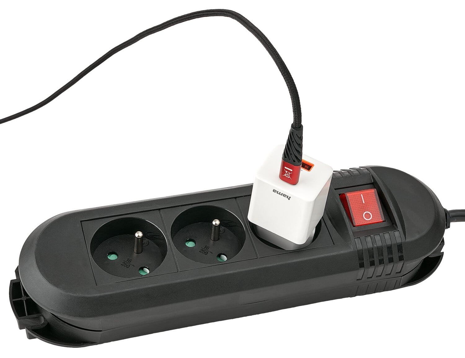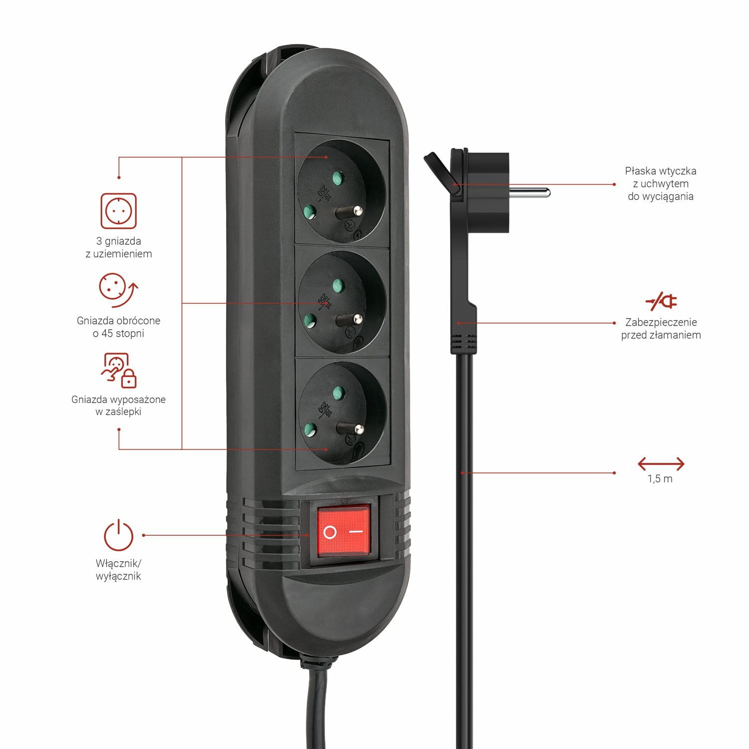 - Dwubiegunowy, podświetlany na czerwono włącznik/wyłącznik, idealny do wyłączania urządzeń, które nie są potrzebne lub znajdują się w trybie gotowości.
